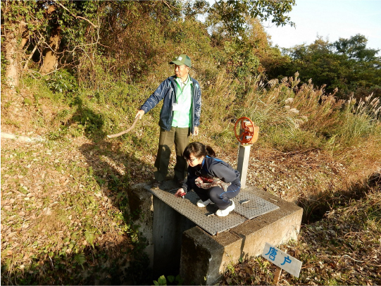 ここ富来のため池の特徴は、後で補助池が作られ2つの池がつながり、一体的に使われていることです。富来地区の池は、山の南の谷に2つが重なっています。池の水は池ごとに掘られた地下水路で北側に出し、2つの水路が合流し川に落とすしくみになっています。