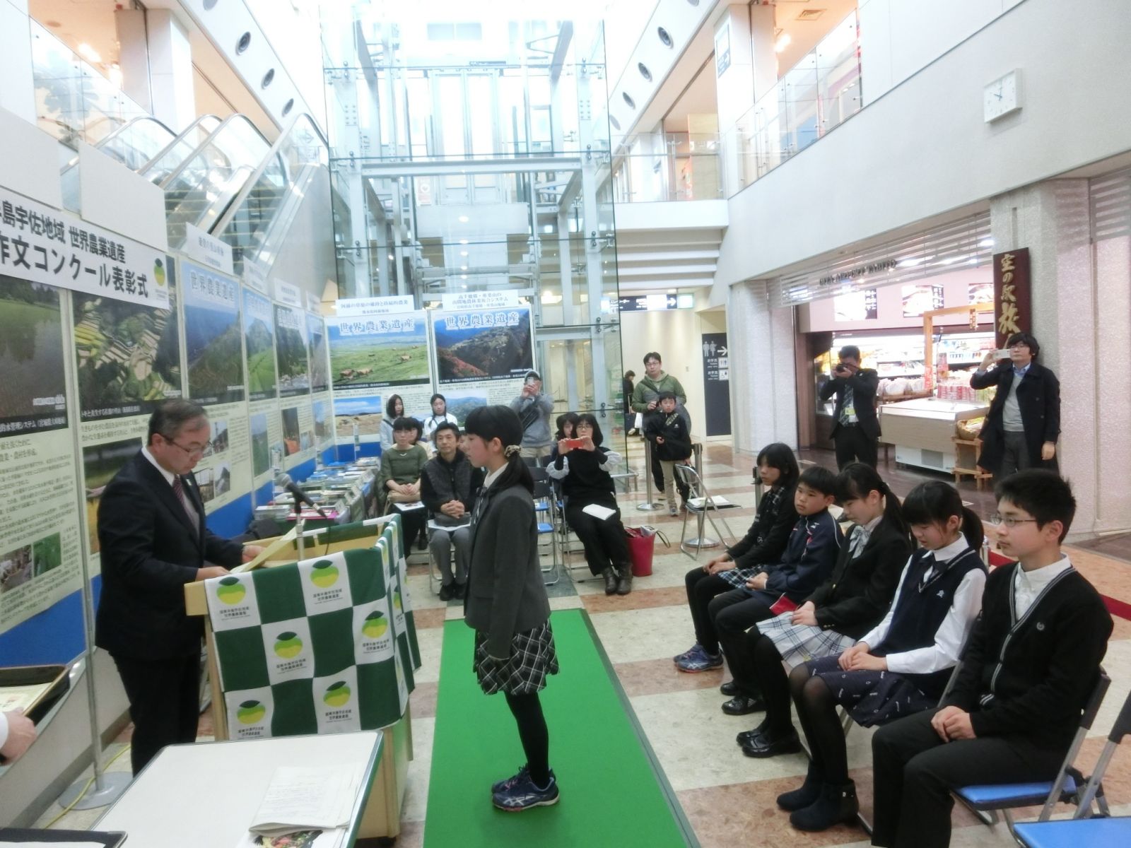 表彰式では、豊後高田市立田染小学校6年緒形清乃さんによる最優秀賞作品「ずっと笑顔で伝えたい」の朗読がありました。作品の中の「祖母が笑顔で話してくれた世界農業遺産の話を次の世代に笑顔で伝えていきたい」という言葉が印象的でした。