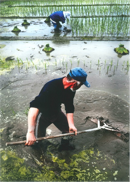 コメント:春の日に七島イ(たたみ表の原料)の苗の植え付け作業。田圃のどろをならすエブリ付きと、植え付けをしている光景です。最近は栽培されてる農家も少ないが、工芸品としても利用。